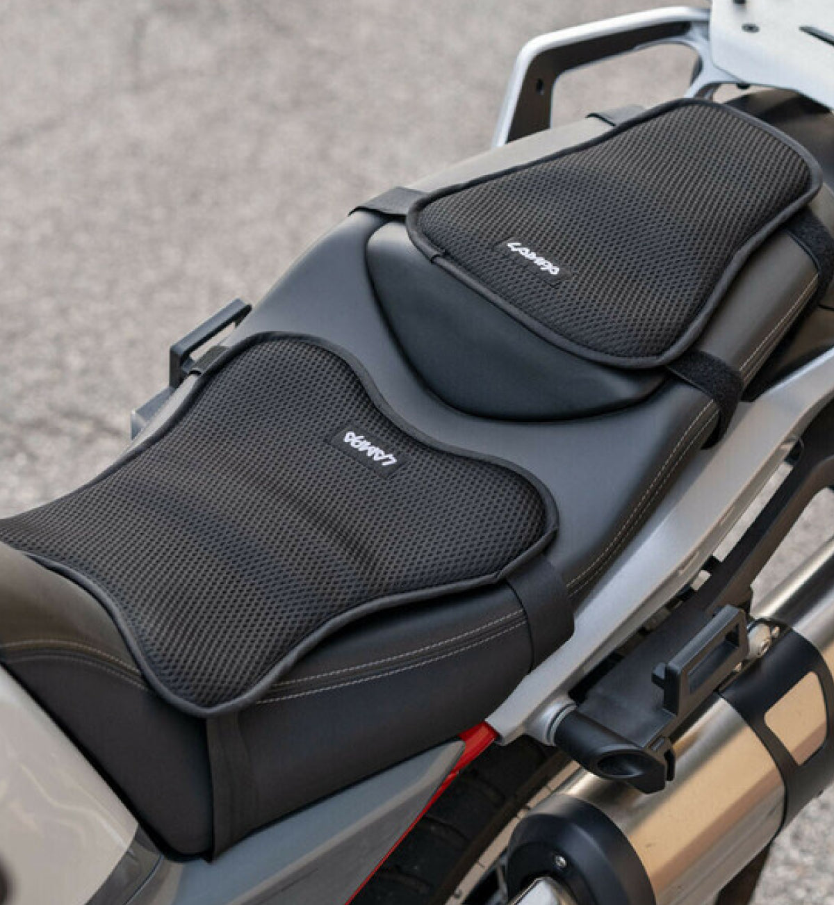 Dzięki połączeniu antypoślizgowego spodu i mocno dociągniętych pasów z rzepami, nakładka Lampa trzyma się kanapy bardzo pewnie. Jeśli jest poprawnie zamontowana, nie wpływa negatywnie na stabilność pozycji motocyklisty nawet podczas dynamicznego przerzucania maszyny w winklach.
